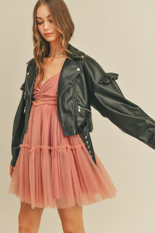Ruffle Faux Leather Moto Jacket