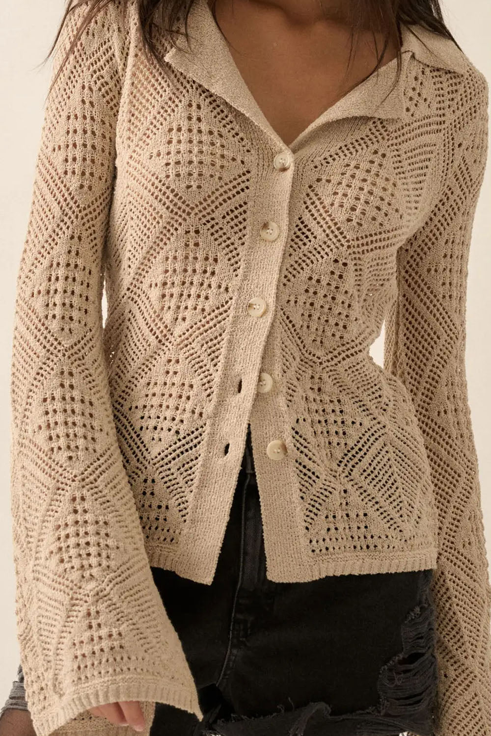 A solid open knit cardigan with a geometric pointelle cable knit pattern. Notch lapel collar, button front closure with tortoise buttons and long bell sleeves. Unlined. Ribbed knit collar, cuffs, and hem. Fitted silhouette.
