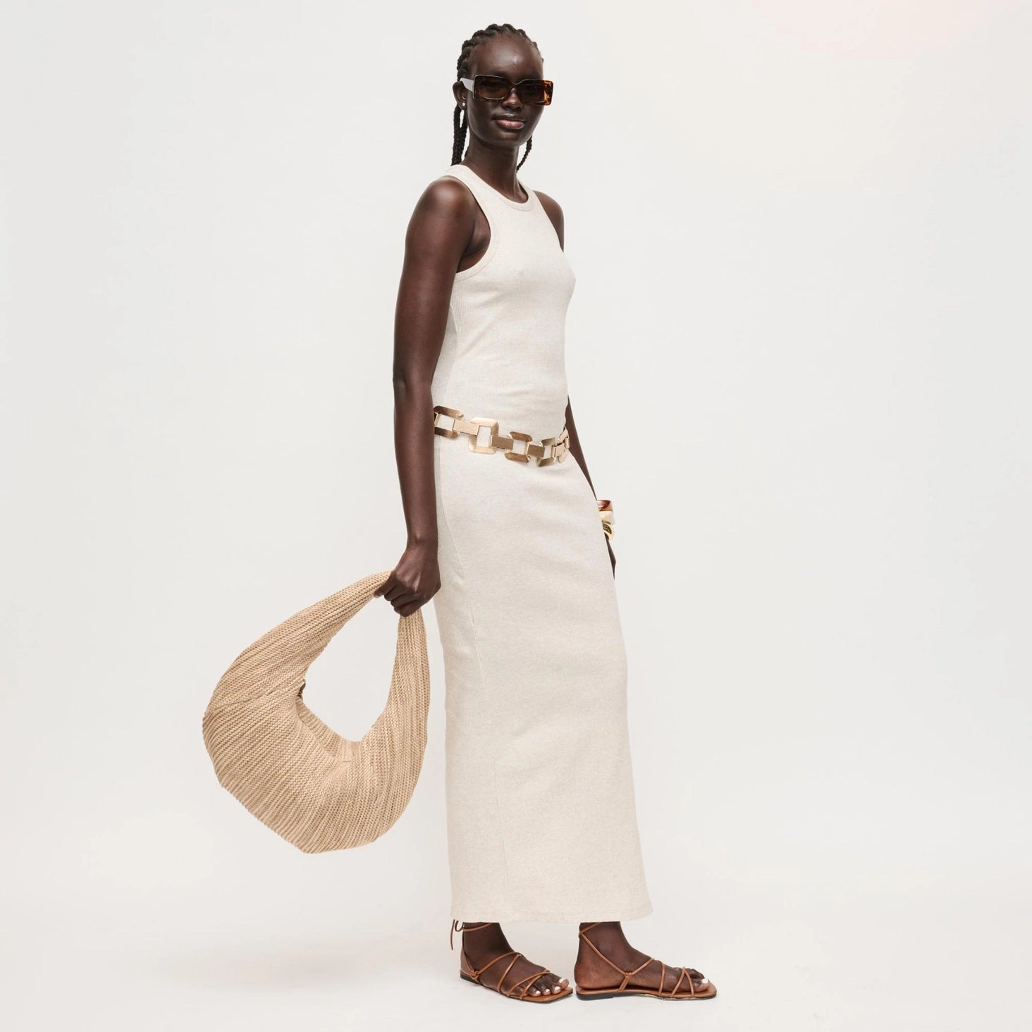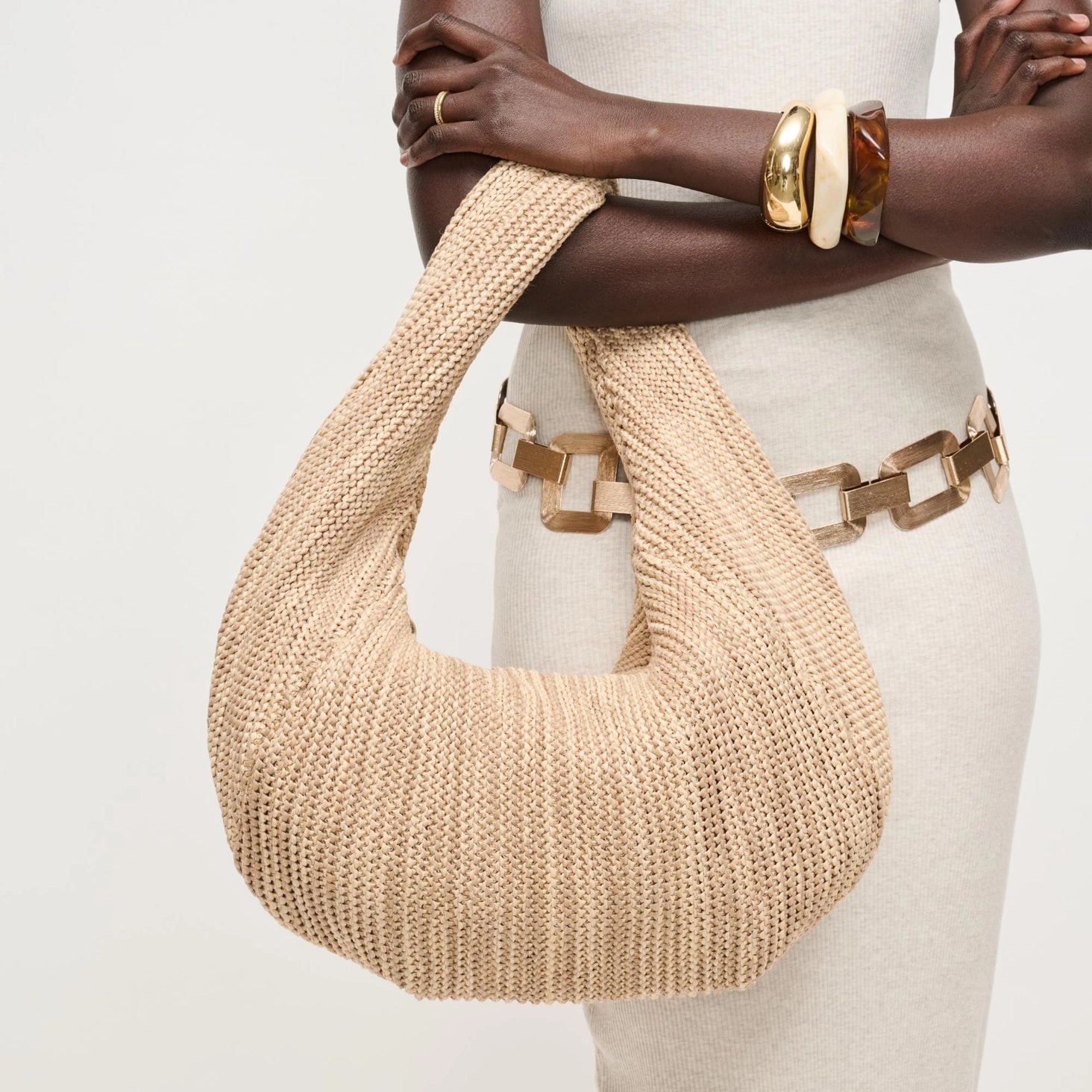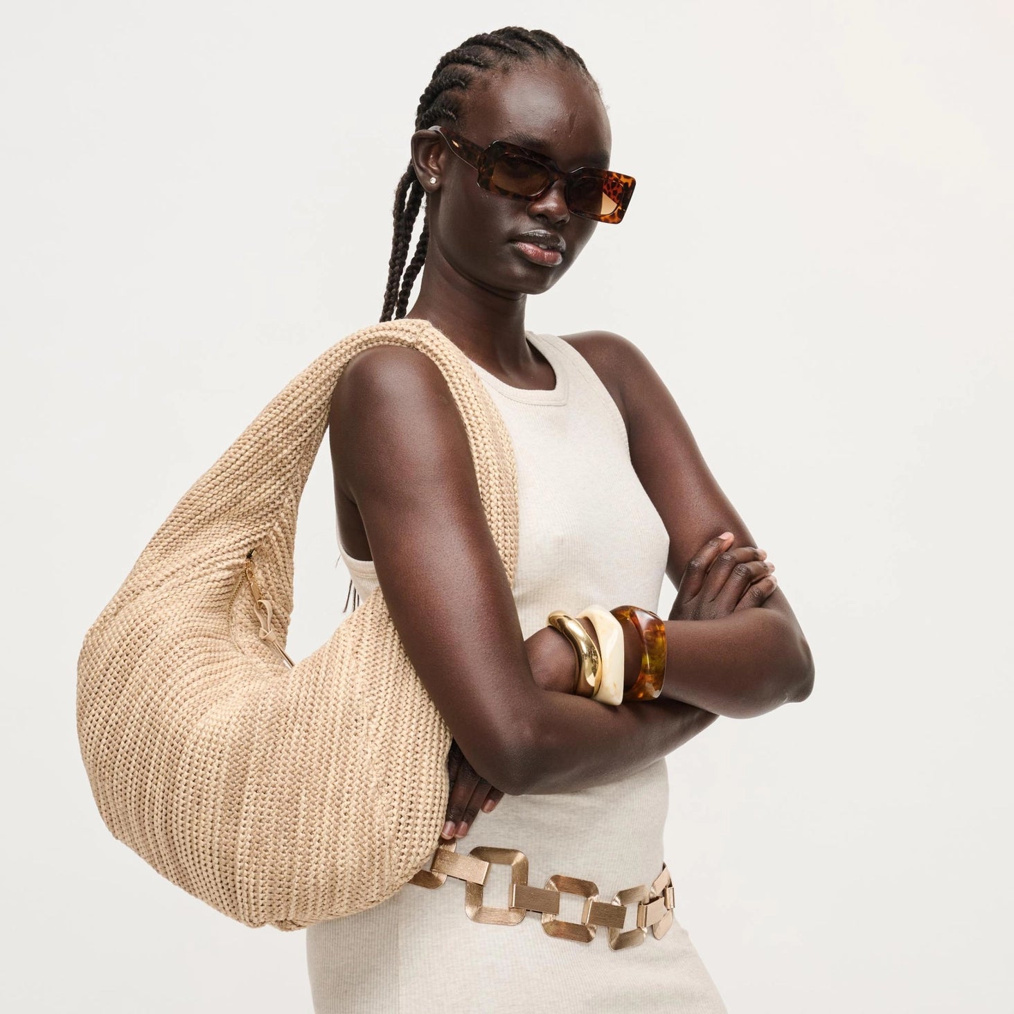 Sculpted knit crescent silhouette — Eleanor Hobo. Roomy slouchy hobo with textured knit, single shoulder strap and secure top zip with slim tab. Lightweight interior fits wallet, phone, a water bottle and more. Vegan friendly materials.