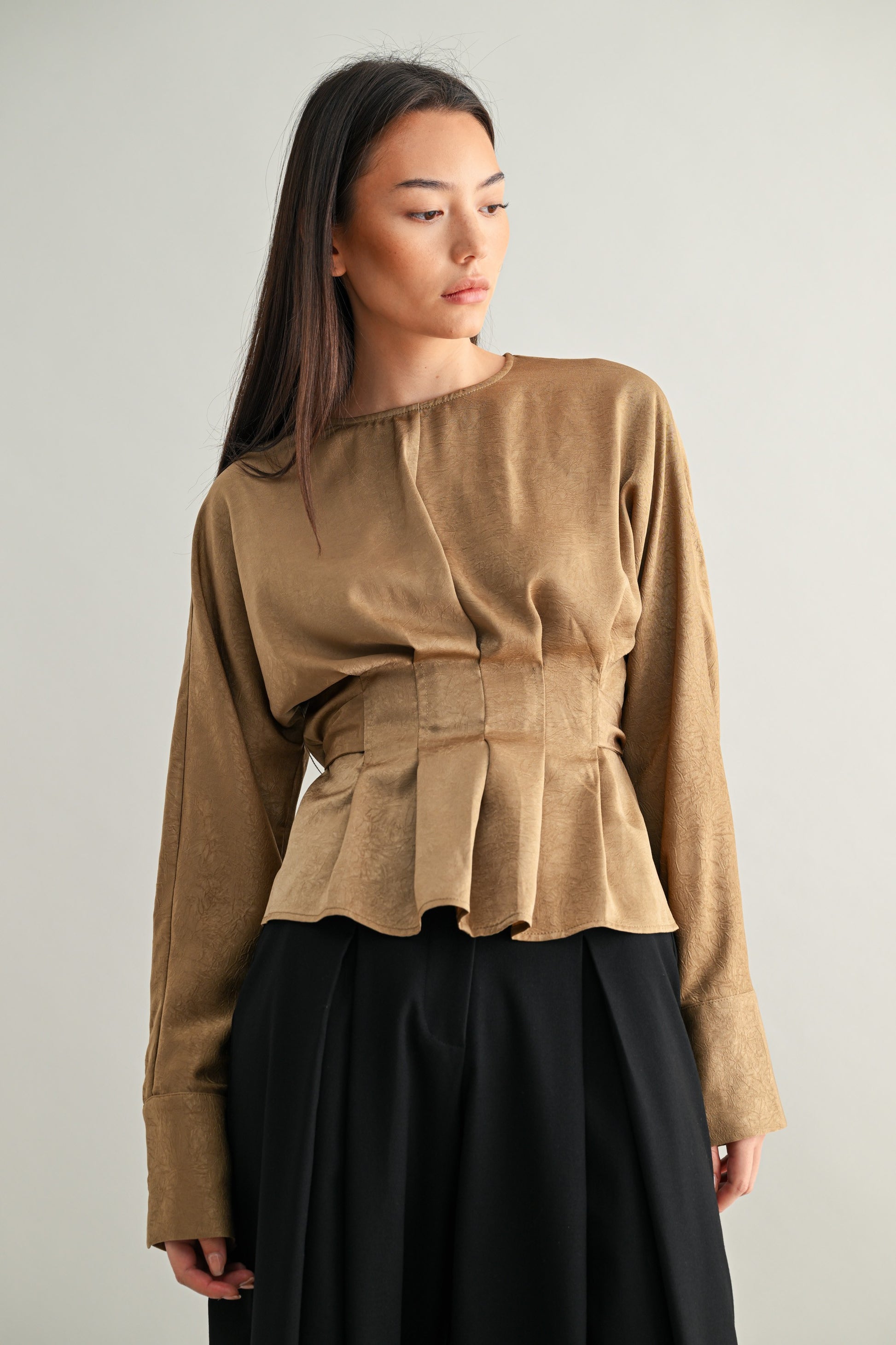 A tie-back pleated blouse designed with a soft peplum silhouette, featuring a crew neckline, relaxed long sleeves with subtle gathering, and extended cuffs for an elegant finish.