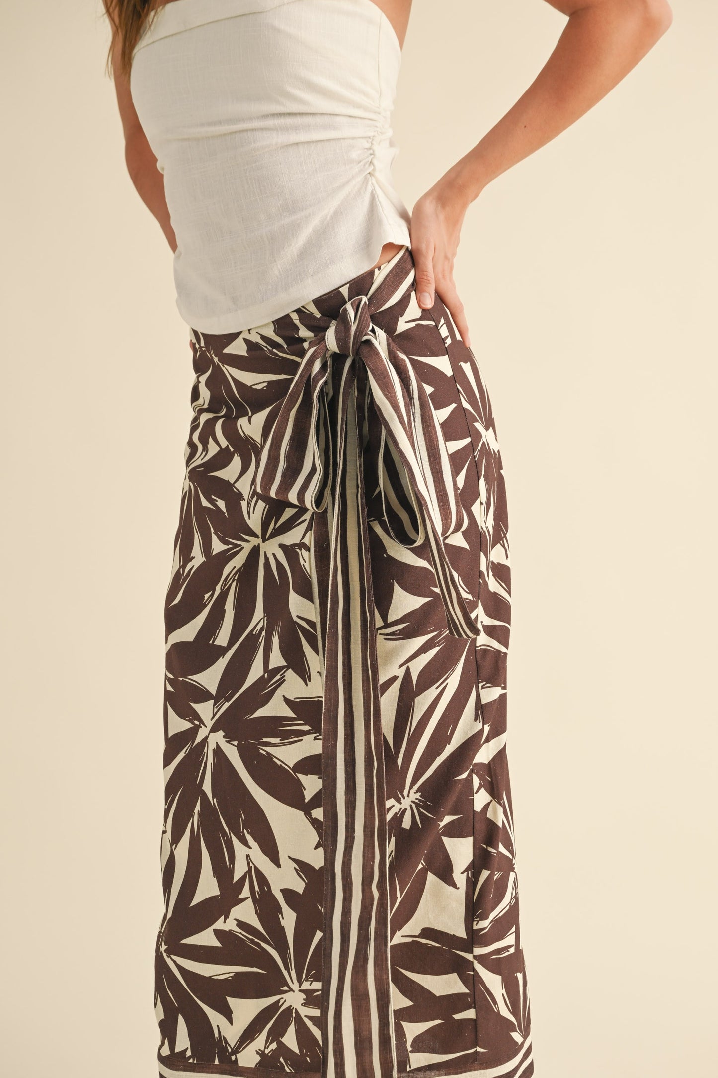 Brown Floral Print Linen Wrap Skirt