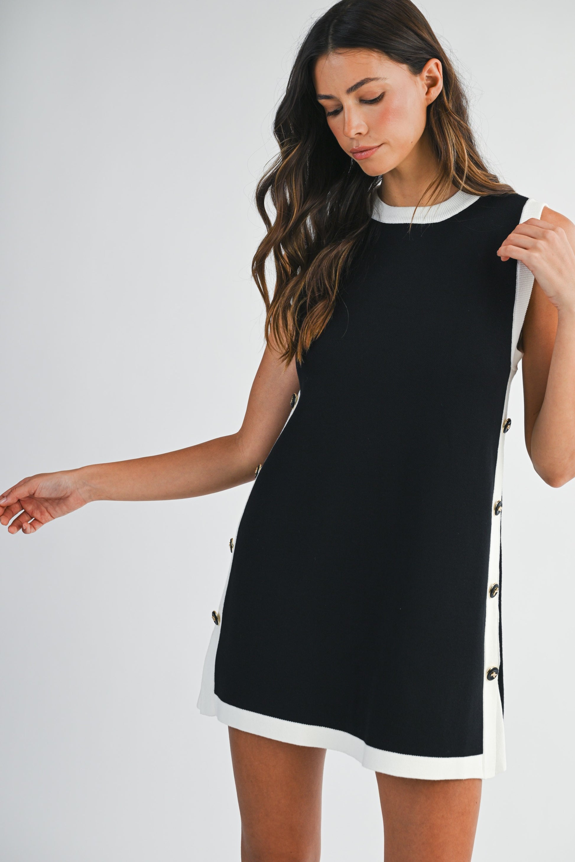Solid knit sleeveless with contrast trim mini dress with side non-functional bow buttons and slit detail.