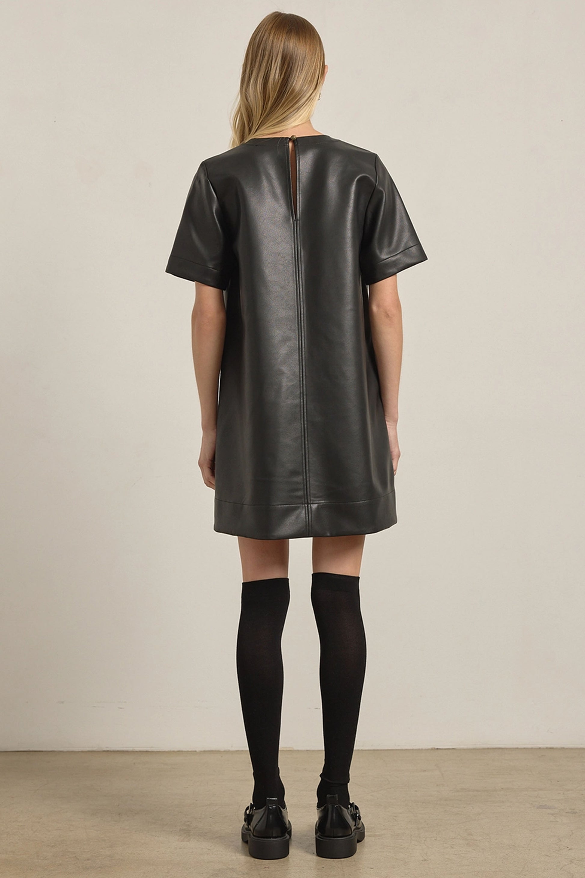 Elevate your wardrobe with this modern faux leather mini dress that effortlessly transitions from day to night. The relaxed A-line silhouette flatters every frame, while the smooth faux leather finish delivers an edgy yet sophisticated vibe. Thoughtful details include short sleeves, a clean round neckline, and a charming back keyhole for understated elegance. Practical side pockets keep your essentials close, and the slip on style means getting ready is quick and easy. Pair it with boots or loafers to complete your fall look—this versatile piece is ready to become a go-to favorite in your closet.