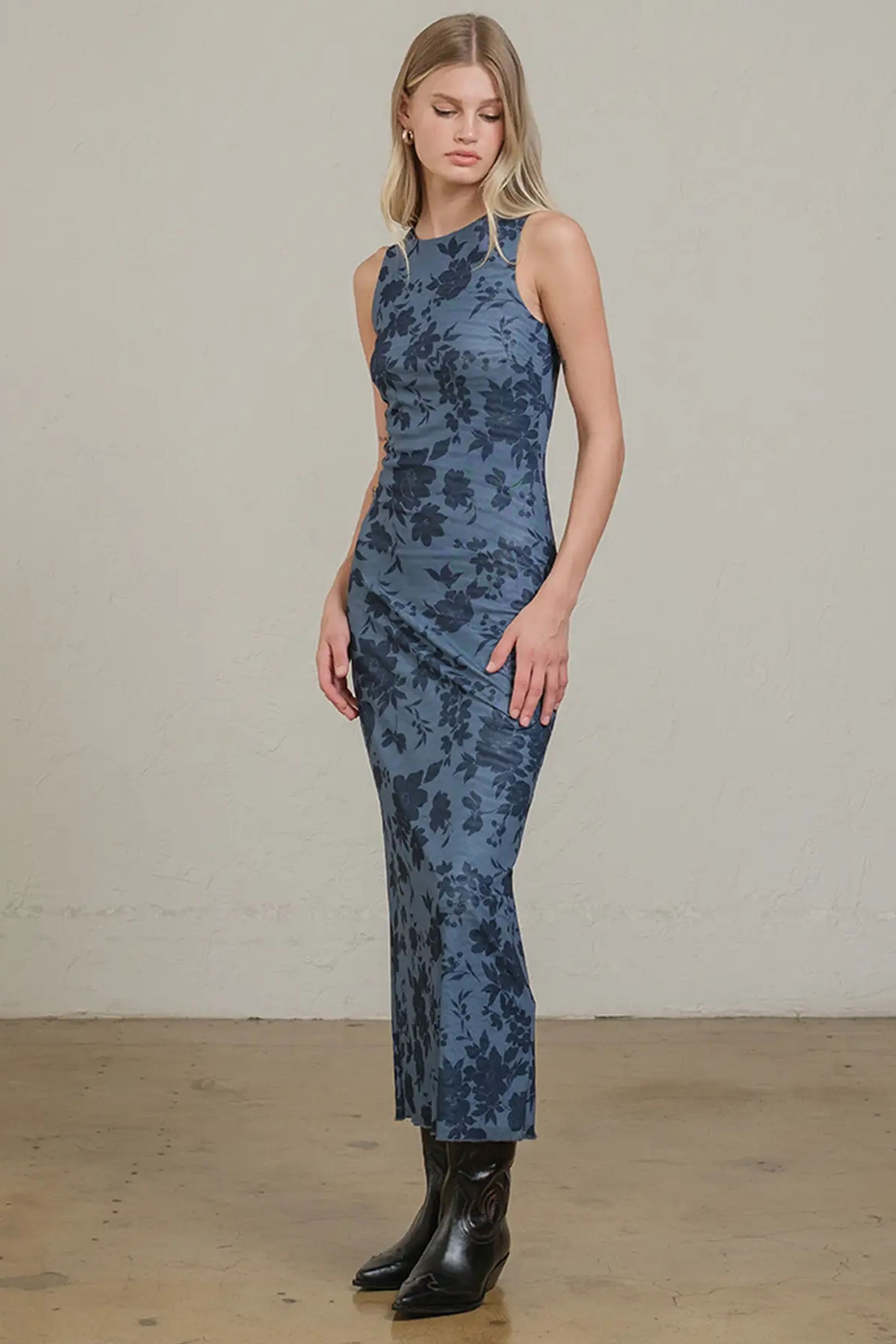 Romantic yet understated, this sleeveless midi dress features a rich navy floral burnout pattern over a smoky mesh base. Designed with a center back slit for ease of movement and a triple-layered construction to ensure no sheerness, it offers both elegance and everyday wearability.