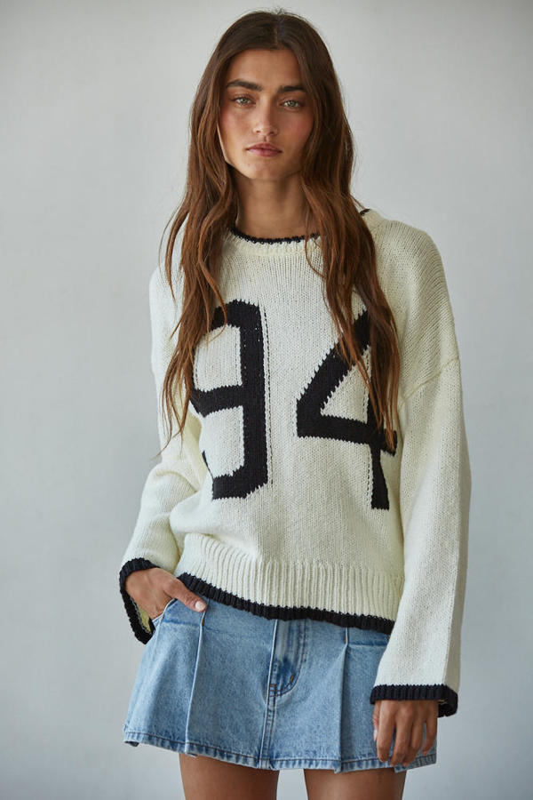 Knit cotton crew neck, long sleeve pullover sweater. Number 94 graphic and striped detail.
