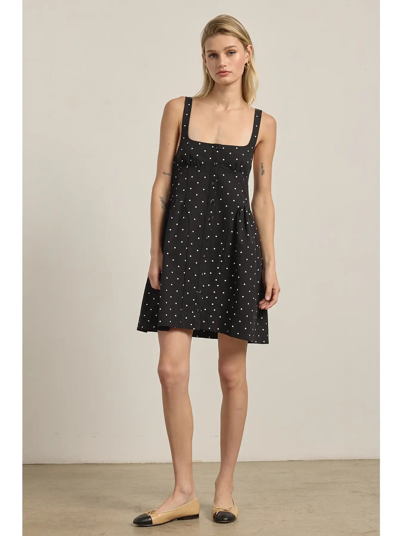 A charming polka dot mini dress designed with a flattering square neckline and wide straps for a structured yet feminine look. The fitted bodice accentuates the waist, while the softly gathered skirt creates a playful A-line silhouette. Functional front button details add a classic touch, making it perfect for spring to summer styling.